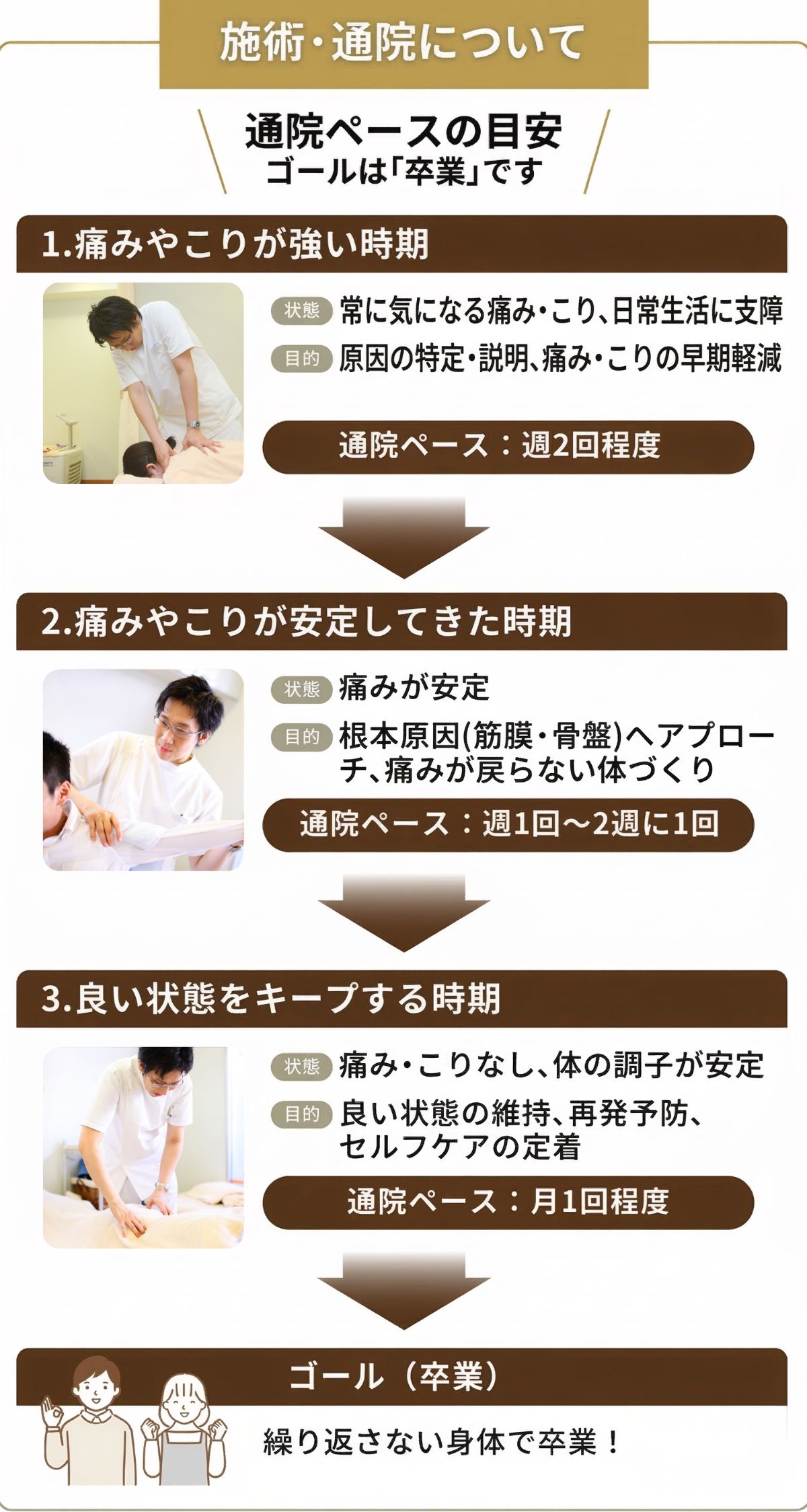 当院の施術は、痛みが出ている「腰・肩」へのケアはもちろん、その痛みの引き金となっている「筋膜」や「骨格」のバランスも緻密に調整します。患部への負担をゼロにするための「全身調整」を行うからこそ、マッサージでは抜け出せなかった"繰り返す痛み"からの根本的な卒業が目指せるのです。