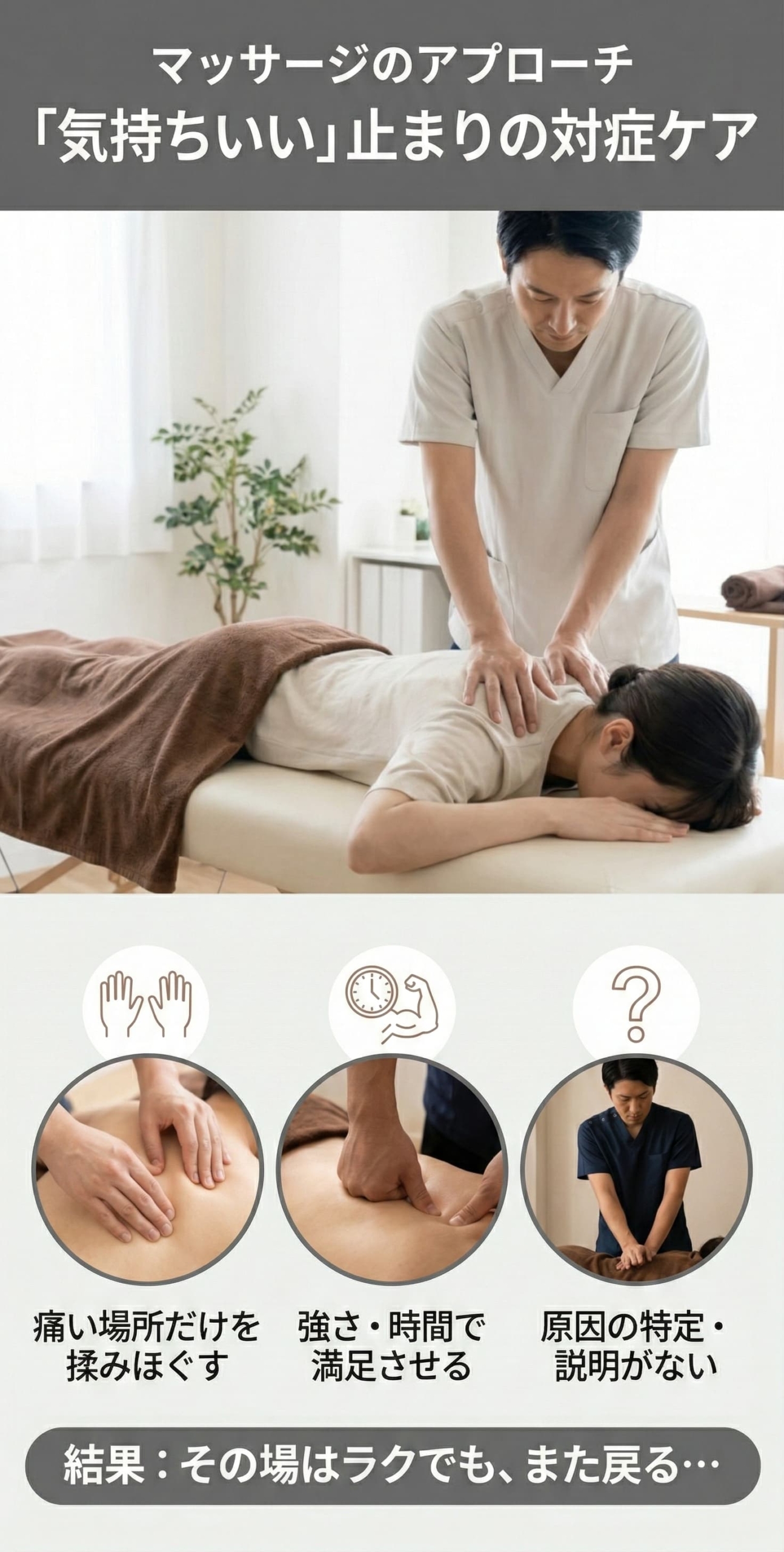 マッサージで痛い場所をほぐすことは、筋肉の緊張をやわらげるために大切なケアです。しかし、ほぐしてもまた同じ痛みが戻ってくる場合、「痛む場所(腰・肩)」と「痛みの本当の原因」が別の場所にある可能性が高いと言えます。